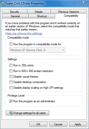 | In the Properties Windows, Select the Compatibility Tab and select "Run as Administrator" as shown below. | |